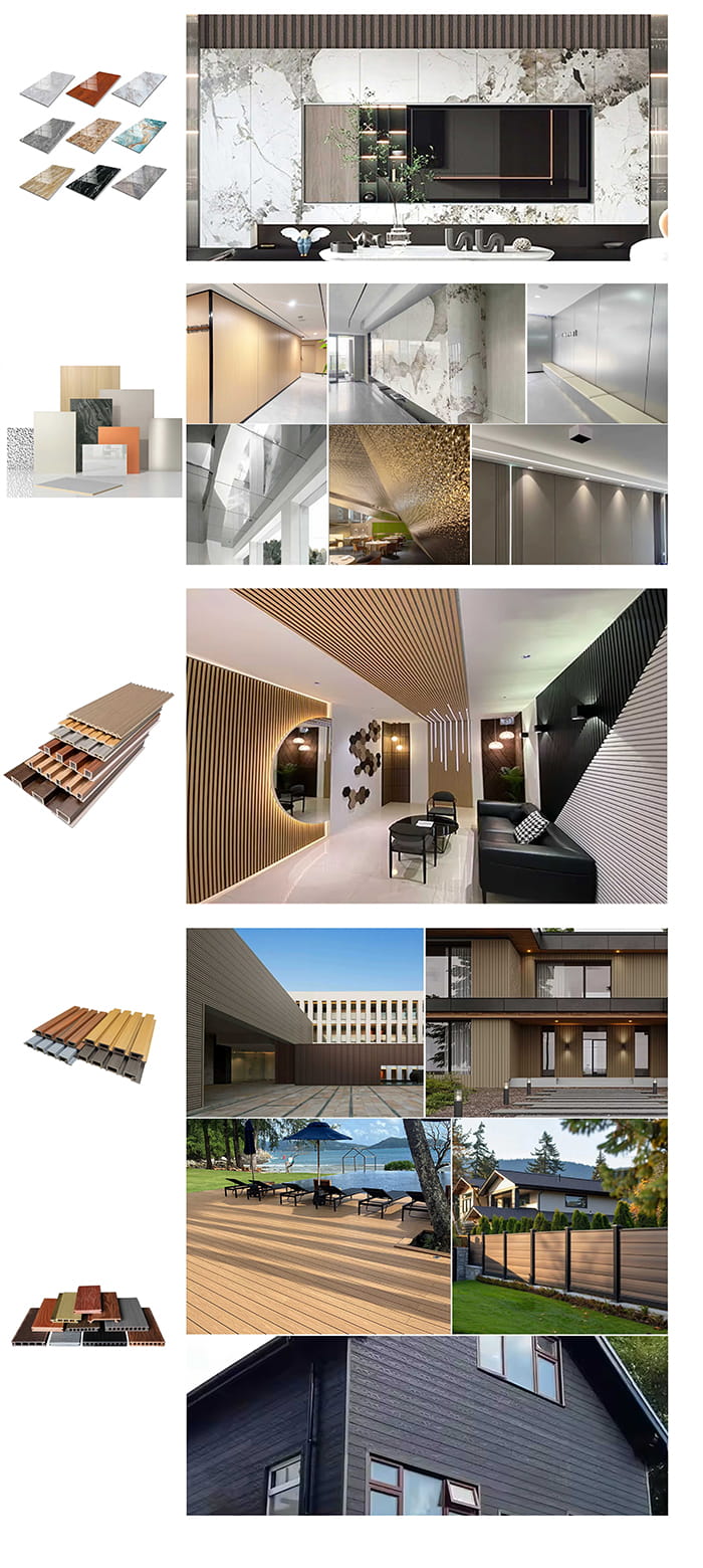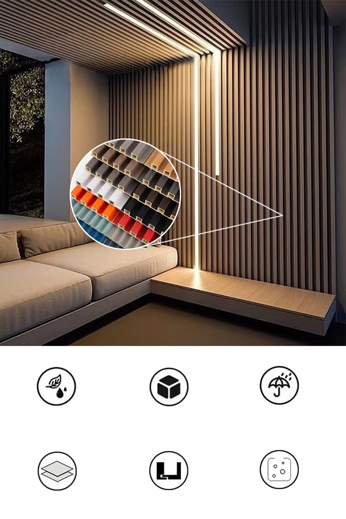 I pannelli per interni WPC sono nuovi pannelli decorativi ecologici realizzati in fibra di legno o fibra di bambù come materia prima principale, composta da resina PVC, polvere di carbonato di calcio e stabilizzante attraverso un processo ad alta temperatura e alta pressione. La superficie adotta un rivestimento UV o una tecnologia di trasferimento ad alta precisione per simulare la trama del legno e della pietra naturali e presenta le caratteristiche di impermeabile e resistente all'umidità, a prova di muffa e antibatterico, leggero e ad alta resistenza. È adatto per pareti interne, soffitti, pareti di fondo e altre scene ed è la scelta ideale per sostituire le tradizionali impiallacciature in legno e i tasselli in plastica.