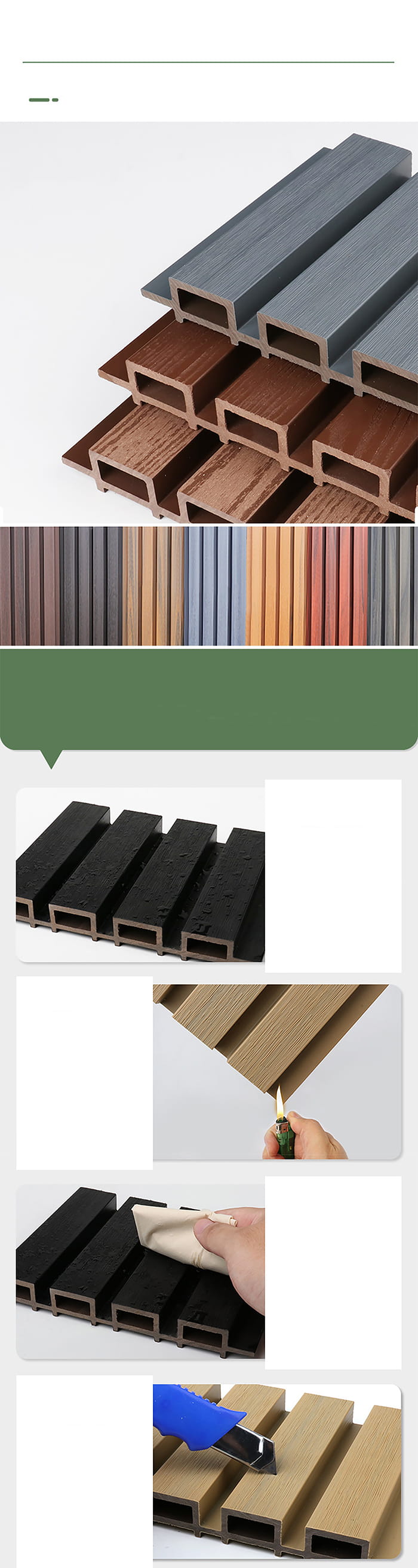 Ispezione di qualità: Durante il processo di produzione, la qualità dei pannelli per esterni WPC viene rigorosamente controllata, compresa l'accuratezza dimensionale, la planarità, la densità, la resistenza al fuoco, le prestazioni di protezione ambientale, ecc.